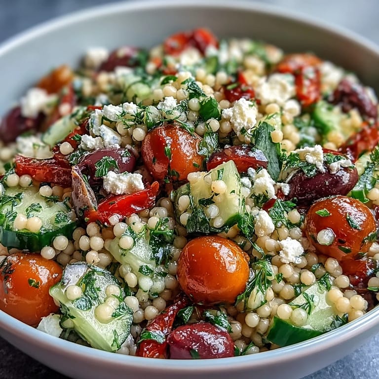 Pin it My neighbor came back from Crete with stories about simple lunches under grapevines, and this salad was her attempt to recreate those afternoons. I watched her toss warm pearl couscous with cold cucumbers like it was the most natural thing in the world. The contrast stuck with me. Now I make it on Sundays when I want something that tastes like effort but really isn't.