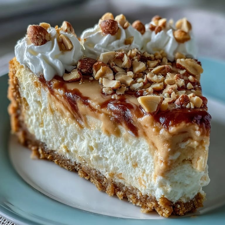 - Before serving, whip the heavy cream with powdered sugar until stiff peaks form. Spread it over the chilled cheesecake and sprinkle with chopped peanuts and extra cookies.